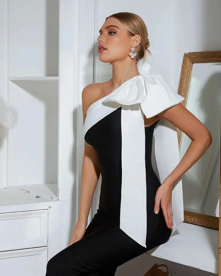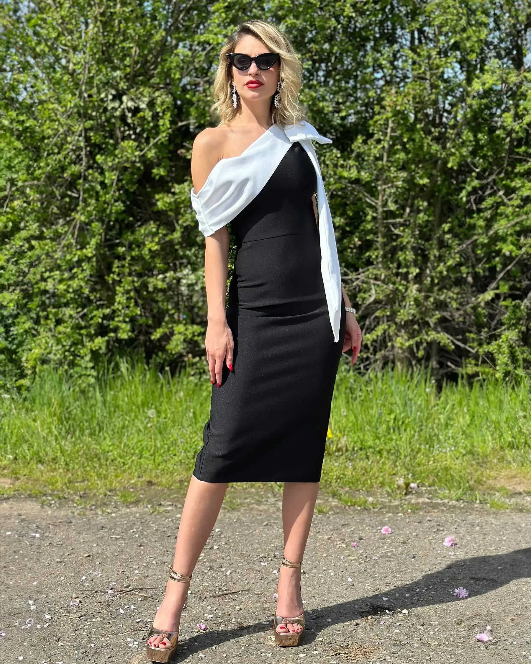 With a flattering white bandage elegantly wrapped around the décolletage & tied in a stately bow, the black blair midi dress is a modernized old-money blend between confidence & grace.